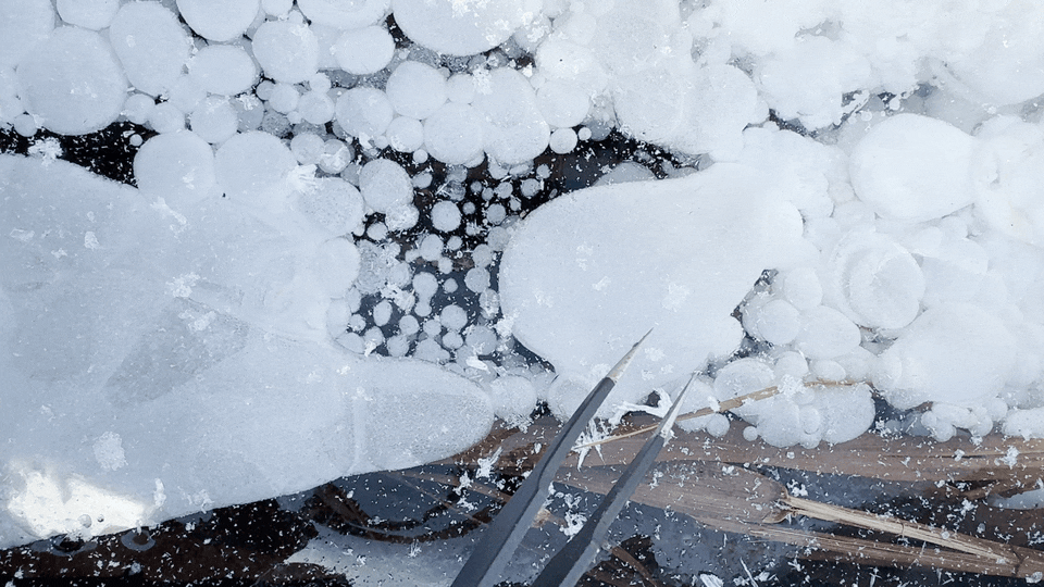 As I found more moments in the creek, I would decide to either animate them or capture them in plain. The movement of the bubbles or water creeping over snowy ice felt like animation itself already. I mean, it is of course animation, it was moving. Instead of needing to put my fingers in everything I let these natural animations sing themselves. When I did meddle, I opted for simple animation that made sense in the moment- dragging a rock along the ice to carve a path, moving water along the ice surface, rearranging bits of snow.